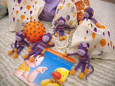Ennek köszönhetően óriási mennyiségű zsákom halmozódott fel az egyes játékok tematikus tárolására. Az egyik kedvencem, a TSB-s zsákom: lila-narancs lufikkal díszített zsák (a Babakezek színei!). Innen már csak egy lépés volt a mostani közös projektünk: