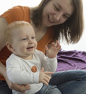 „Matyi 3 éves Down-szindrómás pici fiú, aki miatt az egész család Írországba költözött (Írországban együtt tanulnak a többi gyerekkel az iskolában). Nagyjából másfél éves kora óta jelelünk, azóta a kommunikációnk nagy részét a jelelés teszi ki (a Down-szindrómás gyerekek jóval később kezdenek el beszélni, de tökéletesen értik, amit mondunk, csak nem tudják produkálni a beszédet). Matyi nagyon gyakran nevettet meg minket azzal, hogy ha nem értjük, amit mond, akkor gyorsan jeleli: egyszer az ölemben volt, nagyon ficergett, de nem értettem, mit akar. Amikor a labda jelét mutatta, letettem, hadd labdázzon. Minden dobásnál mondta, hogy adab dob, adab dob. Akkor értettem meg, hogy az "adab dob", amit sokszor mondogat napközben, nem csak halandzsa, hanem azt jelenti, hogy labdát dob.